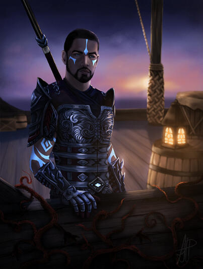 DISPLACED REACHMAN Away from his homeland and culture for so long, he's become almost relentlessly curious about other Reachfolk, who he can be keen on interacting with and questioning.NAIVE Being so quick to trust and befriend anyone who seems kind on the surface makes him an easy target for scapegoating, conning or thievery.HEDGE MAGIC There is something decidedly wild and off about his magic. A single display of it can make it evident that it's nothing like the magic one would learn in a traditional, structured environment.SKINWALKER The ability to influence the behavior of animals and even control them makes him uniquely suited for handling and training beasts. It can also be employed to, under the right conditions and with mixed success, sift through the memories and thoughts of people.FORMER PIRATE Seven years serving Captain Sivier left him with an extensive history of pirating from a rather young age. Past conflicts reemerging or previous victims cropping up is always a possibility.