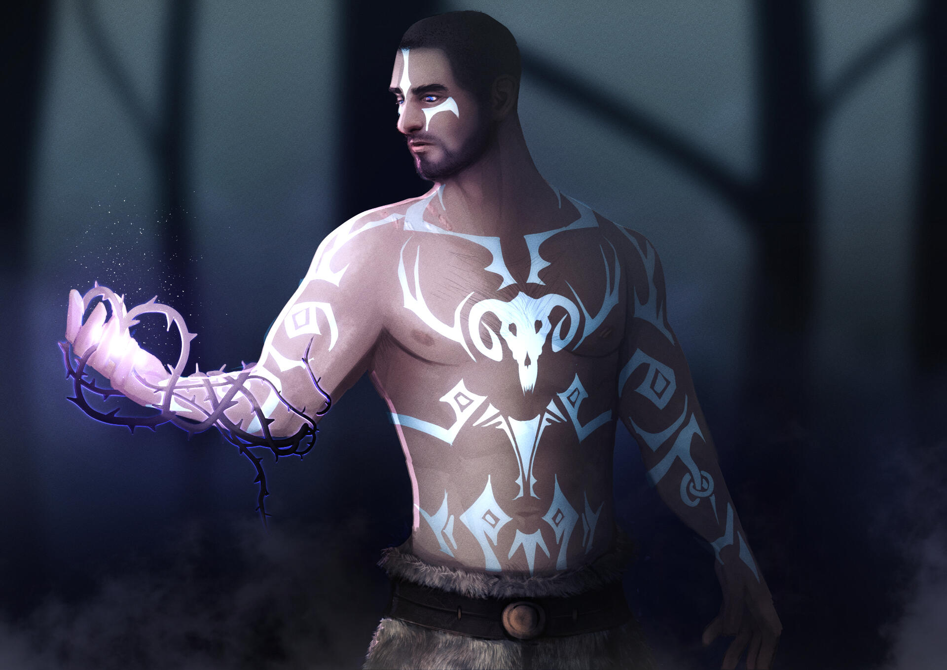 If not for the pale blue tattoos etched along his face, the young man would be easy to forget: he is neither remarkably tall nor short and though his physique is that of a man who has spent the majority of his life doing hard, manual labor, he isn't excessively built. He keeps his hair cut close to the scalp, minimizing upkeep it would require otherwise. A shadow of a beard is maintained, meticulously groomed, and never allowed to overgrow. His attire depends on his location: heavy furs and leathers while traversing Skyrim and The Reach, and a more Imperial-styled breastplate and armor while working within Cyrodiil.Though his tattoos are extensive, traversing most of his body, his usual style of dress tends to hide the majority of them, often leaving only the markings on his face and hands or arms visible. They're ritualistic in design, snaking their way from his ankles to the backs of his hands and up along his throat. The jagged, interlocking patterns culminate into the eerie, monstrous shape of a horned canid skull in the center of his chest. The color is a strange one for tattoos, a blanched shade of light blue that still manages to stand out strikingly against his pale skin.The only real remarkable item he tends to carry with him is a grotesque staff that remains housed in a sort of makeshift sling at his back. It's a primitive-looking thing with a shaft made of a dark, twisted wood resembling a dead tree branch. Atop it sits an atrocious skull that, at first glance, appears to be bovine in nature... but the teeth are a little too sharp and the horns a little too obscure, making it impossible to tell just what sort of beast it originated from. The staff smells of damp earth and rotting leaves, the scent of a thickly forested floor after heavy rainfall.